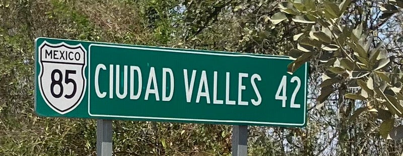 Verder zien we veel 'afstand'-borden. De stad Ciudad Valles wordt al dik 100 kilometer lang met grote regelmaat aangekondigd, inclusief dus de resterende afstand. En die afstand wil nog wel eens flink verschillen met de werkelijkheid. De weg is een jaar geleden nieuw aangelegd en we schatten in dat er toen veel van deze borden zijn aangeschaft. Degene die ze moest plaatsen was a. dronken of b. analfabeet of c. lijdt aan discalculie of d. een combinatie van dit alles. Ze lijken in ieder geval flink met elkaar gemixt. Zo komen we bijvoorbeeld op 20 kilometer van de stad een bord tegen dat het nog 42 kilometer is en 2 kilometer verder een bord dat het nog 13 kilometer is. Lachen!