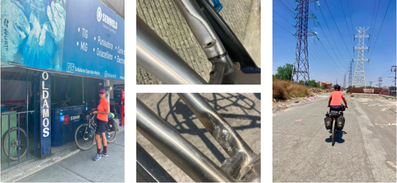 In het centrum van Mexico Stad ligt een heel netwerk van fietspaden. Veel fietsers zijn er niet. Hooguit een paar gebruikers van de deelfietsen, die onderdeel uitmaken van het uiterst intensieve OV netwerk in de stad. We hebben de metro en metrobus genomen, maar er zijn ook gewone bussen, trolleybussen en in het noorden zelf ook een paar kabelbanen. De eerste tien kilometer over de fietspaden zijn gemakkelijk en brengen ons bij de eerste stop, die ook bepalend is geweest in de keuze om door Mexico Stad te fietsen: de titanium lasser. Al in Panama City zagen we dat er slijtage is ontstaan aan de liggende achtervork van Roelie's fiets, daar waar de achterband bijna de vork raakt. Op dat punt is zelfs een klein gaatje te zien. Mogelijk is de slijtage ontstaan op de onverharde wegen met minder druk in de banden en een hoop vuil eraan geplakt, maar zeker weten doen we niet. Het is best raar. Maar dat gaatje moet dicht en dat kunnen niet veel lassers. Na een half uur en €20 armer is het gaatje gedicht. Het laswerk verdient misschien niet de schoonheidsprijs. De lasser is er wel trots op: 'dit gaat nooit kapot'.