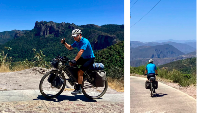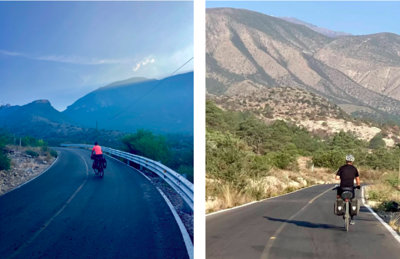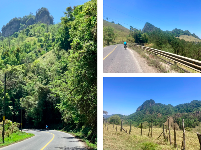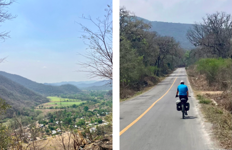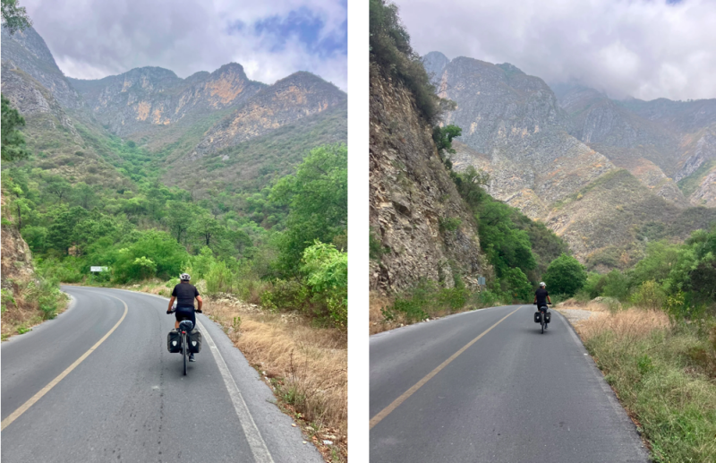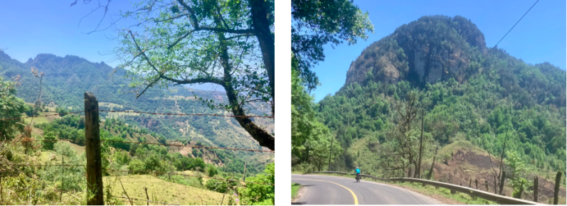 De volgende dag fietsen we meteen door het bos en krijgen we de meest prachtige panorama's voorgeschoteld. Het is een landschap dat we totaal niet voor ogen hadden denkend aan Mexico. Het is golvend, groen en rustig. Het is adembenemend mooi fietsen. De bergen doen ons in eerste instantie denken aan de Schwabische Alb maar aan het eind meer aan de Dolomieten. De glooiende bergen worden steeds ruiger. Tussen Ixtlahueca en Tlanchinol tonen de navigatieapparatuur absurde hellingspercentages. De vallei duikelt akelig steil onder ons naar beneden en de rotswand aan de andere zijde is loodrecht omhoog. De hoogtelijnen buitelen over elkaar heen en dat is voor een kartograaf moeilijk om een weg doorheen te trekken. Een net te ruime bocht op kaart en Komoot geeft een helling van 36% aan.