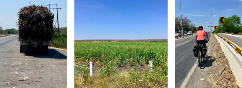 Ook hier buiten de vallei is het nog best groen, maar dat komt vooral van de geïrrigeerde suikerrietplantages. Het vervoer van suikerriet gaat gepaard met veel verlies onderweg. De vluchtstrook en berm ligt werkelijk bezaaid met (al dan niet gehakseld) suikerriet, een beeld dat we al vaker sinds Peru zijn tegengekomen.