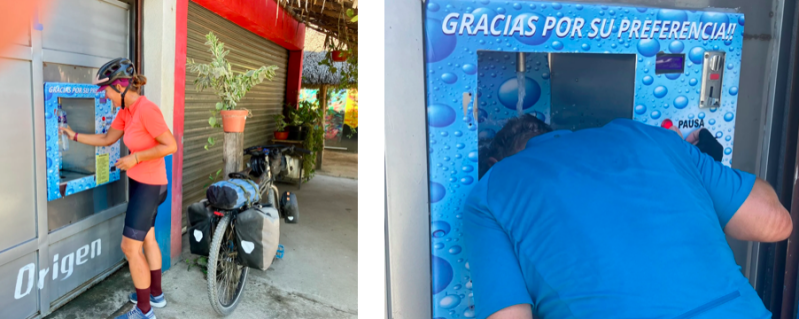 Zo halverwege de etappe zien we een mega fabriek liggen. In de omgeving van de fabriek, voor de poorten en op het fabrieksterrein staan honderden vrachtwagens te wachten totdat zo hun suikerriet, al dan niet gehakseld, kunnen lossen. De fabriek verwerkt het suikerriet tot een dikke stroop, de melasse. Vrachtwagens met die melasse verlaten de fabriek weer. Zo'n mega fabriek en al die logistiek er omheen, leidt tot enige bedrijvigheid rondom de fabriek: een paar huisjes, veel eettentjes en tiendas en een watervulstation. Voor het eerst in Mexico gaan we daar eens gebruik van maken: we hebben iets van anderhalve liter nodig. We kijken naar de opties: een fles, een halve fles en een gallon (ongeveer 3,8 liter). We gaan voor de veilige optie van een halve fles en gooien 6 pesos, iets van € 0,30 in de gleuf. Blijkt dat die na anderhalve liter nog lang niet klaar is. Het water blijft maar stromen, totdat we op de pauzeknop drukken. Wij vermoeden nu dat de volgorde van de drie keuzes van veel naar minder gaat en dat een fles een grote is van waarschijnlijk 12 liter. Oké, we hebben dan nog 4 liter tegoed maar hebben niets meer nodig. Pauzeren kan dus, maar stopzetten en muntjes terugkrijgen kan niet, dus Harry besluit om zijn lichaamstemperatuur wat omlaag te brengen door zijn hoofd in de machine te steken. Lekker!