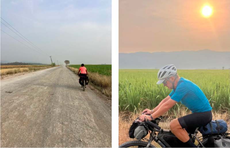 De volgende etappe is inderdaad iets beter, maar vooral ook langer en meer klimmeters. Om half zeven zitten we alweer op de fiets, want bijna alle hoogtemeters zitten vandaag in één lange klim van 20 kilometer. Die klim begint pas na ruim 50 kilometer en die willen we absoluut niet pas in de middag doen. De omgeving van die eerste 50 kilometer is hetzelfde verhaal als gisteren: suikerriet overal en maar één dorpje onderweg. Verschil is dat de bergkammen wat dichterbij komen en dat het uiterst heiig is. We vragen ons af of dit ook door de suikerrietplantages komt. Nog heel vaak wordt vóór het oogsten de onder de planten liggende droge bladeren in brand gestoken, dit om slangen en dergelijke te verjagen. De suiker bevattende stengel raakt wel geblakerd, maar wordt niet aangetast.