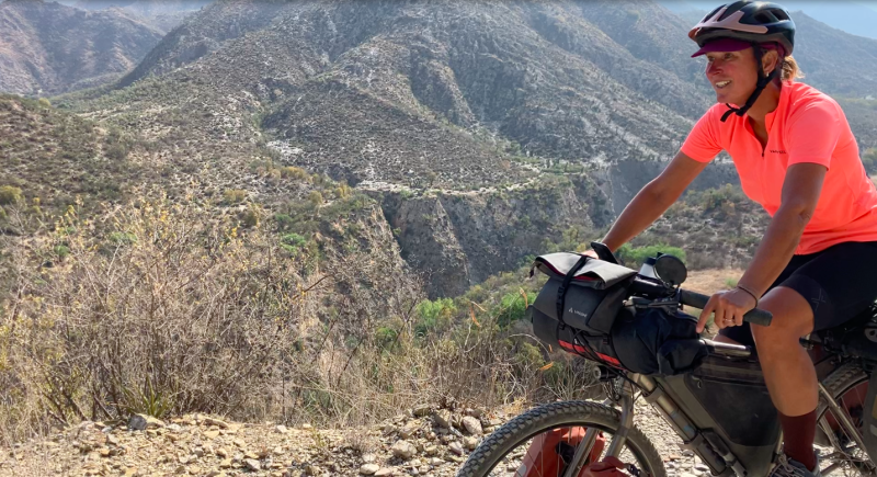 De verwachtingen zijn hoog voor deze etappe en het valt niet tegen. Sterker nog, het is een prachtige etappe door een imposant landschap. Het fietsen over onverharde paden, wij alleen helemaal alleen, door zo'n imponerende omgeving, is voor ons het ultieme genieten. Beter wordt het niet. Slechter wordt het wel als Roelie omvalt. Onhandigheid gecombineerd met een foto maken, geen snelheid hebben, een voet aan de grond willen zetten maar uit balans raken door net op een richeltje uit te komen. Zoiets en dan ligt ze om en schaaft de knie aan het gravel. De foto kan nu in alle rust genomen worden terwijl de fiets nog op de grond ligt.