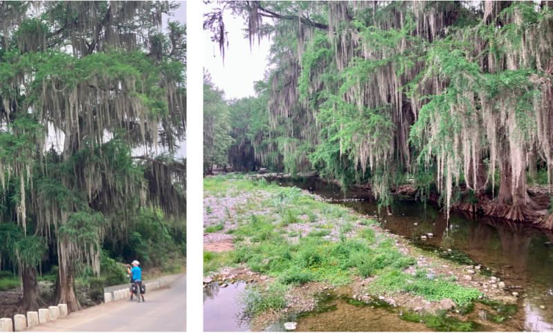 Het hotel is wel een prima uitvalsbasis voor een route 'less travelled' naar Monterrey. Deze route volgt achterafweggetjes, soms verhard, soms onverhard, door het landbouwgebied ten zuiden van Monterrey. We zijn blij met deze route, maar vinden deze ook niet altijd logisch. Zo passen we de route onderweg een paar keer aan en moeten we een keer omfietsen omdat een brug ontbreekt of een weg te slecht is. Het is hier bijzonder groen en ondanks dat we zowat op zeeniveau zijn fietsen we door de wolken.