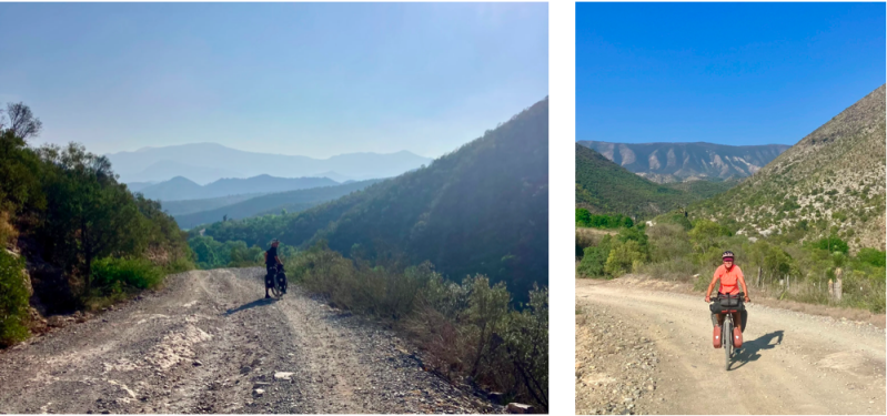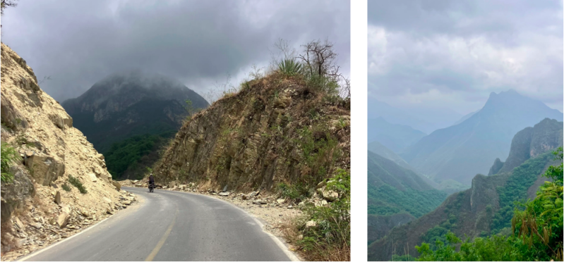 Zoals verwacht fietsen we na de top pas echt de wolken in. Het zicht is zeer beperkt, want ook aan deze kant zien we soms een glimp van robuuste bergtoppen. De afdaling naar een tijdje af. Inmiddels hebben we besloten om naar de stad Montemorelos door te fietsen. We passen de route aan en onze zeer gewaardeerde route-app verzint voor onze vermoeide lijven weer iets moois: twintig kilometer plakkende klei en grove keien, gelardeerd met extra stof en een hoop gevloek van Harry.