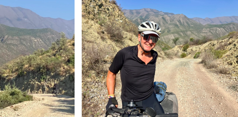 Ook als onverhard weer verhard wordt, blijft het een schitterende route. We zien vanuit het oosten dat een band wolken boven de bergkam hangen. Die willen er overheen rollen, maar ze lossen in eerste instantie heel snel op in de droge warme lucht aan deze kant. Er wacht ons nog een klim van 13 kilometer en ook die is mooi. De wolken winnen aan terrein en we fietsen niet meer in de zon en dat is prettig tijdens de klim. We zijn namelijk weer aardig laag uitgekomen. Op iets van 700 meter hoogte steken we de heldere licht groene rivier over en we klimmen dan weer naar 1300 meter.