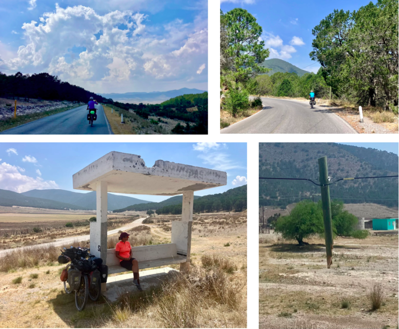 Het dorp La Ascencion heeft niet veel om het lijf, maar wel een heel fijn hotel met een spontane, aardige eigenaresse en een goed restaurant. De fietsen mogen in de garage staan. In de supermarkt vinden we niet de juiste ingrediënten om zelf te koken en dat is excuus genoeg om bij het restaurant te eten. Geen taco's dit keer, maar een salade met kip en een gegrilde kip met groenten met rijst en met extra frietjes erbij. Erg lekker allemaal en eigenlijk iets te veel. Het ontbijt van huevos rancheros is een beetje zwaar en dat ligt aan onszelf, want omdat het lekker smaakt, eten we alles op. We kunnen er weer tegen aan. De weg naar Galena is heerlijk rustig, geheel geasfalteerd en deels door bos. Leuk fietsen dus. Niet spectaculair, maar makkelijk en ontspannend.
