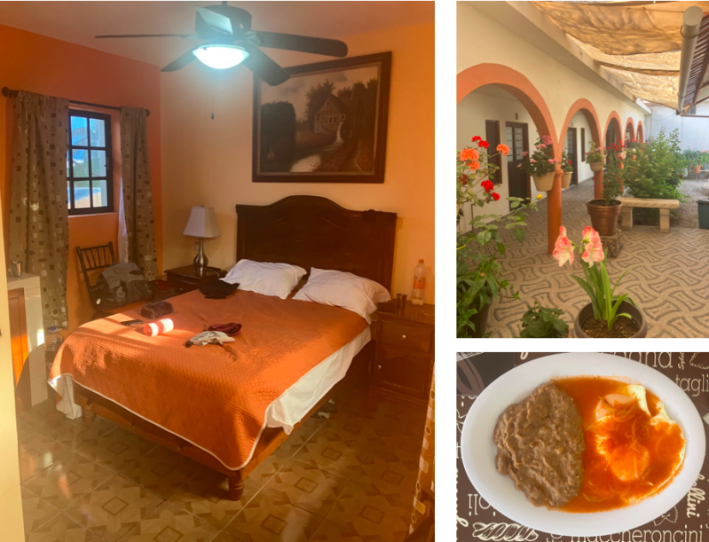 Het hotel in Galeana dat op grond van de reviews onze voorkeur heeft, biedt een kamer aan die twee keer zo duur is, als dat gezellig kamertje van gisteren. De kamer is ook twee keer zo groot. De inrichting is veel minder gezellig maar goed er is een soort terras waar we kunnen koken. Het beddengoed is van dikke soort badstof, met brede ribbels en daar is het veel te warm voor. Bovendien vragen we ons bij dit soort bed-'linnen' of dat wel elke keer in de wasmachine verdwijnt. De ventilator maakt enorm herrie. Het lijkt wel een opstijgende straaljager. Er is maar één raampje en dat is klein. Het wordt dus een warme nacht. Net als zo vaak staat er een extra bed in de kamer. Een kamer sencilla heeft één bed (meestal een smal tweepersoonsbed van 1,40 meter breed), goed genoeg voor ons, maar vaak mogen we met z'n tweeën niet in een sencilla. Dat zijn kamers voor eenpersoonsgebruik. Een beetje flauw want in een doble staan twee bedden van dezelfde maat als in een sencilla. Deze keer besluiten we beide bedden te gebruiken en apart van elkaar te slapen. '