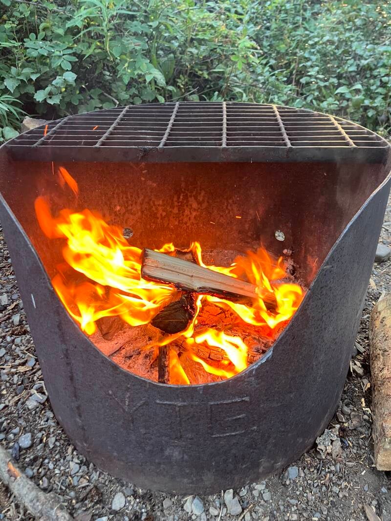 Op de dag van vertrek doen we het rustig aan. Doel is om een camping te bereiken aan Fox Lake en dat ligt op 70 kilometer met weinig hoogtemeters. Als we aankomen, blijkt het ramvol te staan en op de enige onbezette tentplek staan twee Indiërs, die ook net zijn aangekomen. Gelukkig besluiten zij de plek niet te nemen en kunnen wij er de tent opzetten. Inmiddels weten we ook hoe het werkt met het betalen van dit type overheidscamping en hebben we vergunningen voor overnachtingen gekocht via internet en kunnen we het nummer invullen op de envelop. Het is spotgoedkoop, net als in de VS. Per nacht betalen we CAD$20 en dat is iets van € 12,50. De wc’s zijn kluistoiletten, die wat minder fris ruiken dan de grotere versies in de VS, maar er is wc papier. Weer geen kraantje maar wel gratis houtvuur, al moet dat gekloofd worden en daar lenen we een bijl voor.