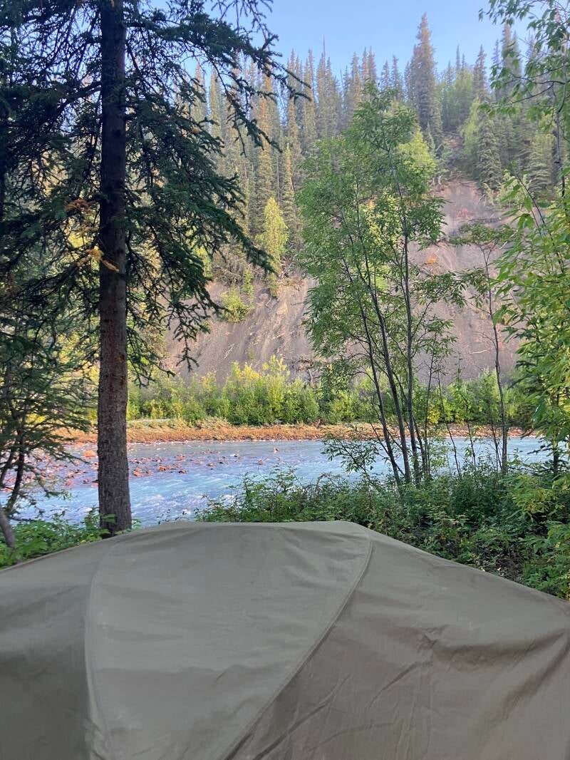 We zijn vandaag laat begonnen en we stoppen niet erg laat na bijna tachtig kilometer bij Rock River campground. De laatste twintig kilometer waren niet fijn fietsen, want Roelies versnellingskabel zit muurvast. Geluk bij een ongeluk is dat die in de vijf staat (van de achttien) en dat er maar één steiler stuk in zit waar ze moet duwen. Dit is al vaker gebeurd en het wisselen van de kabel is een klus waar we alle gereedschappen en onderdelen voor bij ons hebben, maar het luistert nauw: gelukkig is er een gedetailleerde instructievideo beschikbaar op internet. Voor het geval dat we een keer zonder bereik het klusje moesten klaren, hebben we de video op onze laptop gezet. Helaas ligt de laptop ergens in Whitehorse op ons te wachten nadat we die op de veerboot hadden laten liggen. Balen! Onze hoop is dat op de camping iemand een Starlink heeft en dat we via internet de video kunnen zien en volgen. Opnieuw helaas: er is niemand op deze overigens prachtige camping.