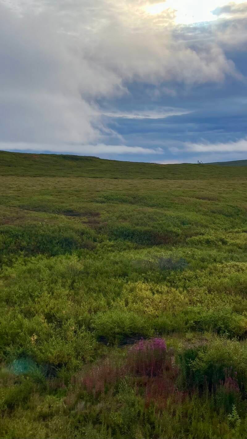 Verrassend genoeg stelt de bewolking niet heel veel voor voor en na een paar (ijskoude) kilometers duiken we onder het wolkendek door en gaan die laagjes weer snel uit. Het is een prachtige dag met een ander, toendra-achtig, landschap en we genieten er nog veel meer van wetende dat door die kapotte kabel, dit bijna niet was gelukt. We fietsen verder naar het noorden en de bergen vlakken steeds verder uit.