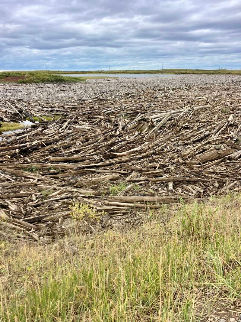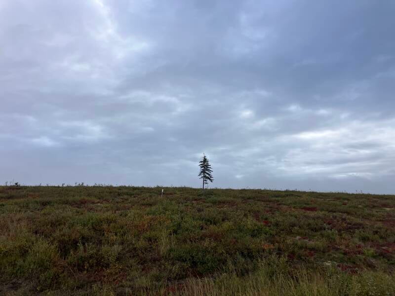 De absolute boomgrens (op zeeniveau) hebben we al kort na Inuvik achter ons gelaten. Het landschap is opnieuw volledig anders. Voor zover we er iets van kunnen zien, fietsen we door een moerassig toendra landschap met vele plassen en meren. Het is mistig en koud en het regent bij tijd en wijle. Pas in de middag wordt het zicht beter, maar de kou blijft. Even pauzeren betekent afkoelen en dus zitten we elke keer al snel weer op het zadel. Na zo’n veertig kilometer slecht wegdek rijdt ons een grinder tegemoet, een egaliseer machine. Daar waar de grinder is geweest, is het wegdek goed. Eigenlijk tot aan Tuk valt de weg daardoor wel weer mee.