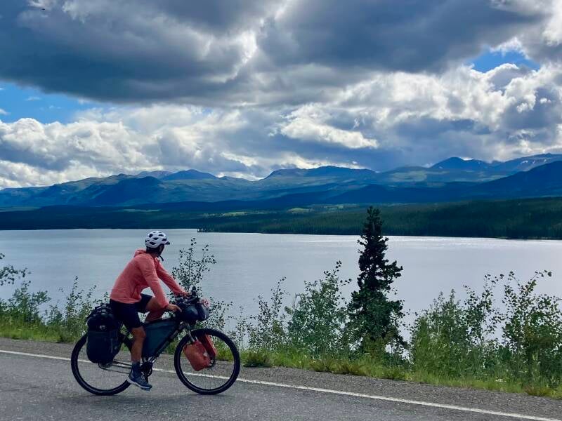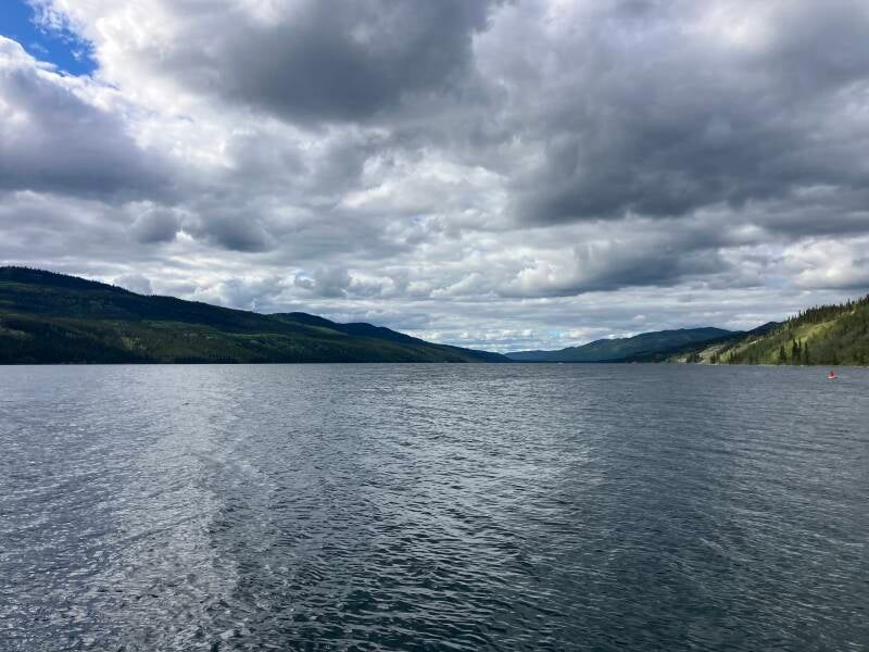 We houden nog een pauze aan Kookatsoon Lake voordat we een drukkere weg bereiken en een dikke tien kilometer op de vluchtstrook pezen om er zo snel mogelijk af te zijn van het langsrazende verkeer. We fietsen nu langs de Yukon River, waar ook dit deel van Canada naar is genoemd: Yukon Territory. De rivier is bijna drie keer zo lang als de Rijn en mondt via Alaska uit in de Beringzee.