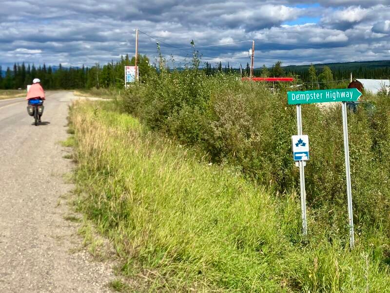 Het wordt een heel lange dag, maar we halen het. Zo’n veertig kilometer voor het eind ligt de afslag naar de Dempster. Die fietsen we nu voorbij en wat we nu nog doen, moeten we weer terug. Nooit leuk, maar noodzakelijk aangezien de Dempster Highway nauwelijks voorzieningen heeft en we voorraden moeten inslaan. Met de wind in de rug is het geen zware opgave, al denken onze billen daar anders over.