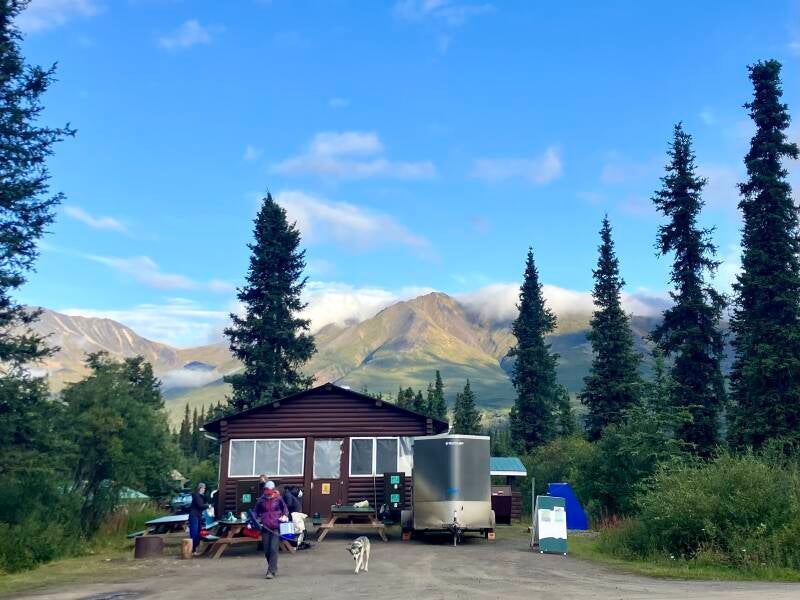 Het blijkt later maar goed dat we water van de mannen hebben gekregen want de kreek die we na de klim volgen heeft helemaal geen fris kleurtje: rood en iets verderop oranje geel. We herinneren ons dat Sylvia heeft gewaarschuwd hier niet uit te drinken. Dankzij de mannen hoeft dat ook niet. We fietsen nog een eindje en slaan af bij de Engineer Creek Campground. We worden onthaald door motorrijders die ons eerder voorbij zijn gereden en helemaal trots op ons zijn en even verderop door twee stellen die met hun caravans geparkeerd staan en ons ook eerder die dag hebben ingehaald en die zich afvroegen of we het tot deze campground zouden halen. Leuk zo'n onthaal! We vinden een plek dicht bij de schuilhut met kachel en raken in gesprek met de studenten die op een plek aan de andere kant van de hut met meerdere tenten staan. Ze doen onderzoek naar de permafrost en blijven voor meerdere weken hier. We lenen een bijl van hun voor het kloven van het hout voor kampvuur en horen dat het water van Engineer Creek, waaraan de camping ligt, dezelfde is als waarlangs we net gefietst hebben en dus net zo goor. We waren er al bang voor. We lopen terug naar stellen die zo enthousiast hadden staan klappen en die zijn helemaal blij om ons aan drinkwater te helpen.
