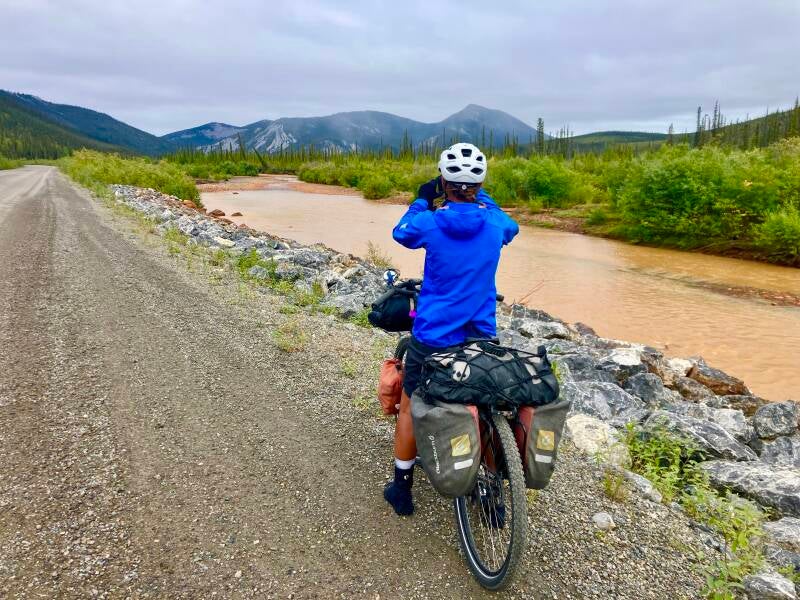 Tussen Fort McPherson en de volgende en laatste veerboot komen we Jeroen tegen. Hij volgt ons (en wij hem) op Polarsteps en fietst in tegengestelde richting. We dachten dat we hem gemist hadden, maar niet dus. Leuk om elkaar in het echt te zien en nadat we honderden tips over hem uitstorten, nemen we afscheid. Hij heeft het merkbaar moeilijk: hij mist zijn lief, vindt de weg zwaar, strijdt tegen de wind en heeft chaos in zijn hoofd. Wij hebben elkaar, vinden de weg prima, hebben de wind mee en hebben ons goed voorbereid op de Dempster. We beloven Jeroen betere wegen en wensen hem rugwind toe: hopelijk maakt hij zijn beoogde avontuur af helemaal tot aan Ushuaia.