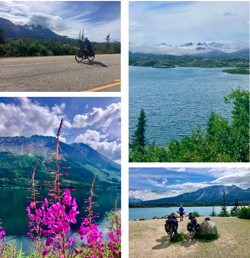 We vervolgen de weg langs het meer dat Windy Arms heet en lezen op een infobord bij een uitkijkpunt hoe het meer aan zijn naam is gekomen. Niet heel verrassend: omdat het hier vaak hard waait. Ontdekkingsreizigers noteerden in een logboek dat ze na 17 uur op een vlot slechts 12 mijl waren opgeschoten. Wij schieten wel lekker op en komen even later aan in de eerste Canadese nederzetting genaamd Carcross. Het heeft niet veel om het lijf, maar wel een visitors centre met wifi / internet, een heel leuk koffietentje, een paar huizen en een strand. Carcross blijkt een afkorting te zijn voor Cariboo (kariboe = hertensoort) Crossing. We blijven lang plakken en het is al middag als we verder fietsen.