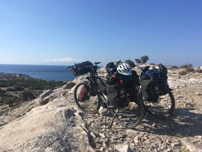 De volgende dag fietsen we langs de kust naar de Griekse stad Alexandroupoli. Een korte etappe waar we uiteindelijk lang over doen. Een deel van de route is fantastisch mooi maar geschikter voor mtb-ers zonder bepakking. We fietsen over een geaccidenteerd terrein, tussen de rotsen en de olijfbomen, over losse keien en grind, langs een oud amfitheater en onherkenbare historische stadsmuren. We komen niemand tegen en de uitzichten zijn allemaal adembenemend.