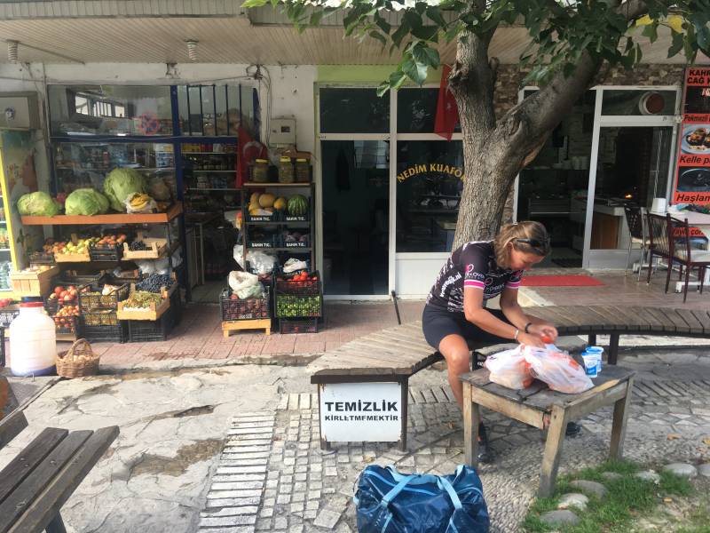 De volgende ochtend staan we al om 7 uur voor het restaurant waar we gisteravond heerlijk hebben gegeten. In tegenstelling tot wat de eigenaar ons had gezegd is de zaak dicht. Geen probleem, we maken wel zelf een ontbijtje. Op een klein dorpspleintje vinden we een winkeltje dat open is. We kopen wat tomaten, ayran (zoute drinkyoghurt), kaas en ekmek (brood) en eten het op een bankje onder nieuwsgierige blikken (zoiets van: ik zag twee europeanen in vreemde kleren een broodje smeren…) op. Alweer gonst het dorp van de bedrijvigheid en levendigheid. Heerlijk om te zien.