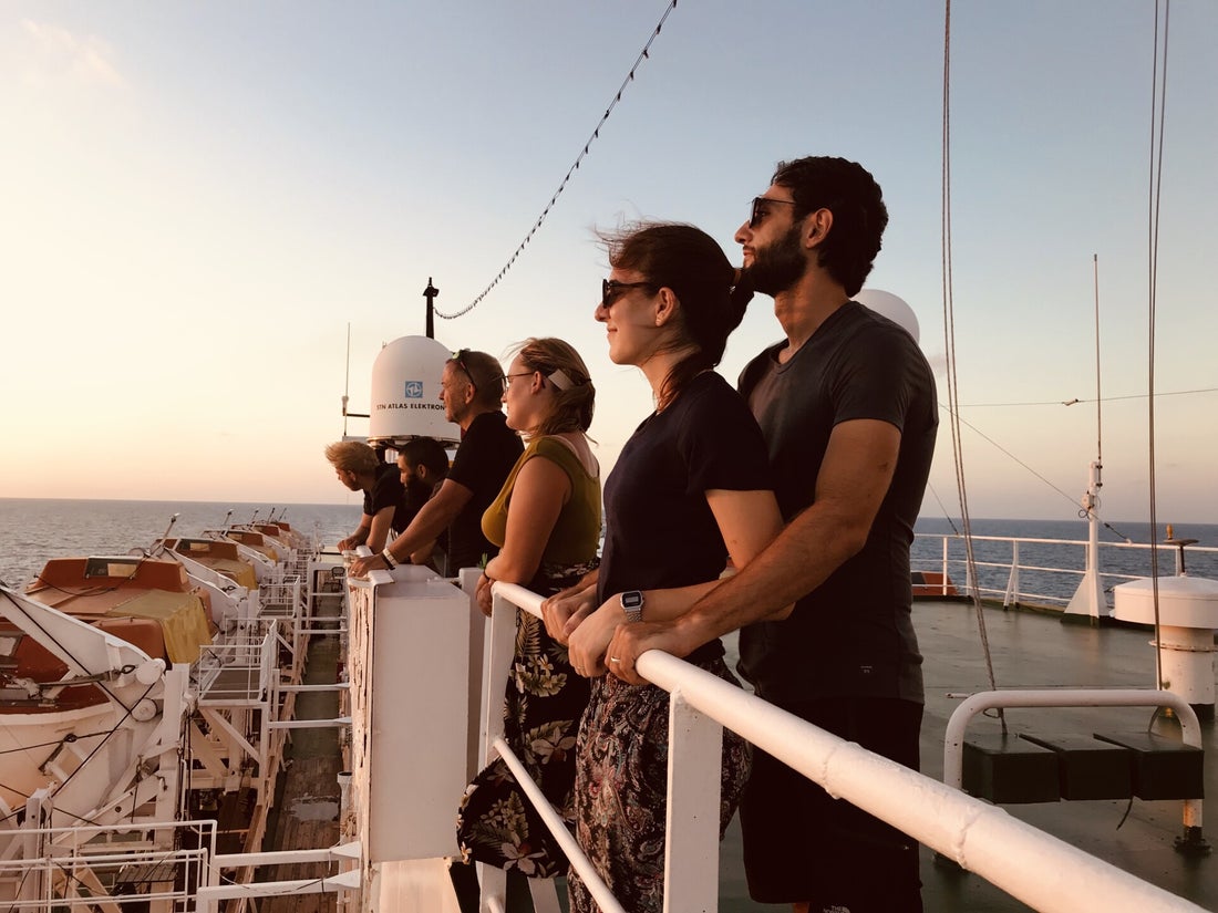Eenmaal aan boord begrijpen we ook wel dat het inschepen lang duurt. In alle trappenhuizen en gangen liggen matrassen zodat er veel meer mensen mee kunnen op de boot. Marijn heeft een ticket waarop ‘no seat’ staat en had mee kunnen doen aan de ratrace. Nadat we die chaos zien, zijn we erg nieuwsgierig naar de 1e klas. We krijgen een sleutel van een kamer in de enige gang op het schip waar geen mensen op matrasjes of deken of karton liggen. De hut blijkt ruim en schoon te zijn met twee prima bedden, een waterkoker, tv en een eigen toilet. Dat laatste is ons grootste goed aangezien de horrorverhalen op internet vooral over het sanitair gaan. Er is zelfs een douche. Dolblij gaan we terug naar het informatiekantoor waar we de sleutel kregen om te vragen waar we water kunnen krijgen en hoe het met eten zit. Een scheepsofficier die toevallig naast het kantoortje zat beantwoordt onze vragen en vertelt dat hij op veel cruiseschepen heeft gewerkt waaronder op de Holland-Amerika Lijn. Hij biedt aan om ons mee te nemen naar het topdeck. Op weg ernaar toe komen we Marijn tegen die een matrasje heeft bemachtigd. De officier roept meteen dat Marijn ook mee moet komen. Marijn zit naast een Frans stel en natuurlijk mogen die ook mee. Tot onze verbazing loopt de route naar het topdeck door de brug en worden we hartelijk begroet door de crew inclusief de kapitein. Boven de brug zit het topdeck en met zijn vijven genieten we van het uitzicht en het privilege dat we hier mogen zijn. We blijven er zeker een uur plakken en in die tijd raken Marijn, Imane en Lucas helaas hun veroverde matrasjes kwijt.