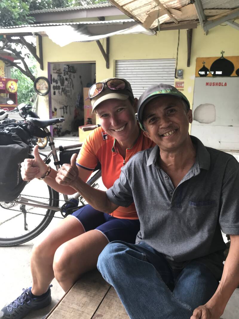 We gaan daarom terug naar de hoofdweg en mogen die 200 meter die we net naar beneden zijn gedonderd nu te voet nader bestuderen met de fiets aan de hand duwend, trekkend, zwetend en buitenadem. Het nieuwe plan is om over hoofdwegen om het National Park te fietsen en in het kustplaatsje Pelabuhanratu de route van Hein weer op te pakken. We fietsen door een hele dure straat vol met imposante villa’s in de buitenwijk van de miljoenenstad Bogor. Even neemt Komoot ons mee naar een achterafweg en worden we getrakteerd op kleine kleurrijke Indonesische huisjes en weer een lekkere klim van >12 %. We zijn trots dat we beide fietsend boven komen. Het lijkt wel of de Indonesische wegenbouwers geen enkele rekening houden met hellingspercentages. De daarop volgende hoofdweg kent ook steile stukken en tegen het eind van middag moeten we zelfs ook op de hoofdweg een stukje duwen. Bovenaan ontmoeten we een vrolijke Indonesische man die Muhter heet en ons een korte taalles geeft terwijl we een noodlesoepje naar binnen slurpen. We krijgen zijn telefoonnummer voor het geval als we ooit hulp nodig hebben. Yep, gratis spontane hulp.