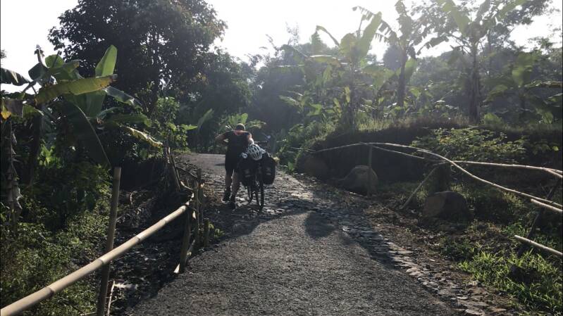 We weten dat ons een zware route te wachten staat. Waarschijnlijk is er eerst een stuk van een halve kilometer en daarna een hele kilometer te steil om te duwen laat staan te fietsen. We verwachten dat we op die stukken met z’n tweeën één fiets ophoog moeten gaan duwen, al dan niet met de bagage er nog aan. Maar het is niet ver meer (33 km) naar de volgende camping en we beginnen met een fijne afdaling. Tenminste dat laat het profiel zien op app Komoot en dat blijkt niet helemaal te kloppen. We dalen in de eerste 3,5 kilometer weliswaar 200 m maar na een beekje moeten er ook weer meer dan 100 hoogtemeters overwonnen worden binnen een korte afstand. Weer meer dan 15% en te steil dus. We lopen alweer met de fiets terwijl we om de 25 meter op adem proberen te komen. Na de eerste sessie duwen, zweten en buitenadem zijn maken we de balans op: de route is nu al te zwaar en we zijn eigenlijk nog officieel in de afdaling en nog niet eens begonnen met de grote klimpartij. We zijn ook bevreesd of we de route wel gaan vinden. In die 3,5 km zat al een routestukje dat niet blijkt te bestaan. Bovendien hebben we nog die tijdstress. We hebben nog maar 10 dagen om in Jogjakarta te komen om het visum te verlengen en met maximaal 40 kilometer op een dag gaan we dat never-nooit-niet halen.