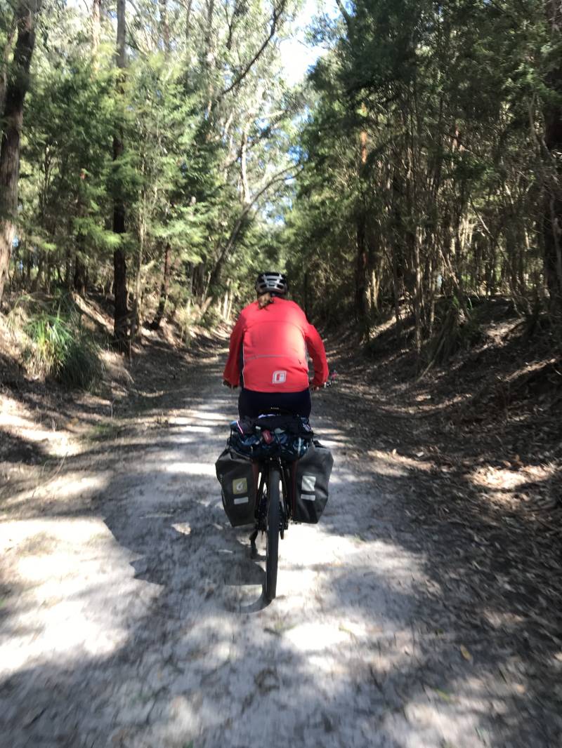 De East Gippsland Rail Trail is een 98 km lang fietspad en we vieren vandaag dat we op dit avontuur de grens passeren van 25.000 kilometer. Onder het mom van “heb plezier met wc papier” leggen we de papieren (of zilveren?) cijfers op de grond en strooien er snel grind over heen voordat ze wegwaaien. Gelukkig hebben we het fietspad voor onszelf en hebben we alle tijd om een selfie met zelfontspanner te maken. Midden op het fietspad stenen stapelen, tripod erop, instellen en (terug)rennen: na een half uur ‘geklooi’ met papier en op-en-neer gesprint, hebben we een bevredigend resultaat.