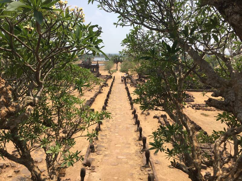 Onder Pakse liggen de resten van een oude stad en tempelcomplex. We fietsen tegen het middaguur ongeveer voor de deur van de tempel langs en besluiten een kijkje te nemen. Op de borden voor de ingang staat dat wandelingen, eventueel gecombineerd met kanovaren minimaal 3 uur tijd kost. Dat zien we niet zo zitten op het heetst van de dag, maar we twijfelen ook of het bord info geeft over een bezoek aan de tempel of aan de omgeving ervan. Als een groepje westerse toeristen aan komt wandelen vragen we het hun. Ze raden een bezoek aan. Het zal ongeveer een uur duren om het complex te bekijken en er zijn een hoop traptreden te nemen met een mooi zicht op de vallei als beloning. De stad en tempel zijn in de 5e of 9e eeuw gesticht, daar zijn onze bronnen niet eensluidend over. De ruïnes van de tempel zijn bouwwerken uit de 11e tot 13e eeuw zijn. Het tempelcomplex is erg vervallen maar nog steeds imponerend en beslaat een groot gebied met inderdaad veel traptreden die uiteindelijk leiden tot een bronnetje, waar ooit Shri (Lord) Shiva gebadderd zou hebben. Dat verklaart meteen de aanwezigheid van het tempelcomplex.
