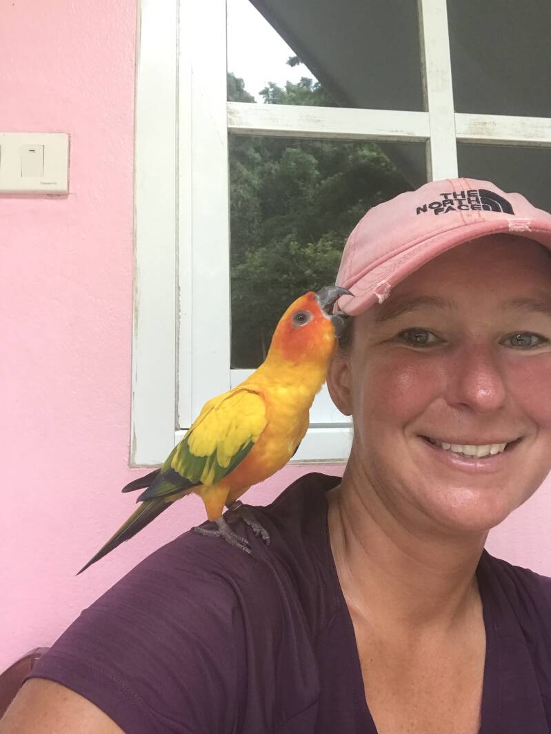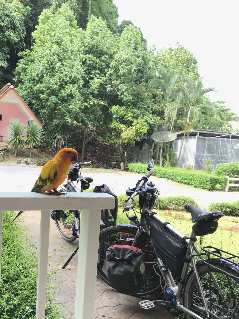 We doen twee dagen over de oversteek naar de overkant en halverwege vinden we een superleuk bungalowtje in Bang Sawan. Op de veranda voor het ‘Hans en Grietje-huisje’ verrast een papegaai ons door heel dicht voor ons op het hekje te gaan zitten. Vanuit allerlei hoeken proberen we de vogel te fotograferen zonder dat die al wegvliegt. Hadden we maar een echte camera met een lens dan konden we ‘m nog veel mooier vastleggen, verzuchten we. Maar dat is helemaal niet nodig. Het beestje is niks niet bang en gaat zelf bij Roelie op de schouder zitten. Wat een brutale vlerk. De pet, shirtje en armbandjes worden met de snavel verkend en voordat er schade gaat ontstaan jagen we de papegaai weg en dat blijkt nog verdomde lastig. Grappig dat we eerst bang waren dat die weg zou vliegen en dat we nu ons best doen om hem weg te laten vliegen.