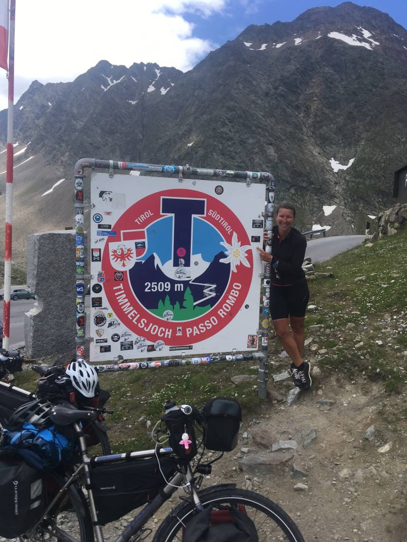 De dag begint bij de apotheek en vanaf daar start de klim naar Timmelsjoch. Halverwege staat een mooi Timmelsjoch bord en een Zuid Afrikaanse dame met Nederlandse roots biedt aan een foto van ons te maken bij het bord. We kletsen wat en wensen elkaar mooie reizen toe. Het begint licht te regenen als we verder klimmen. Aan de top breekt de zon door. Het valt ons uiteindelijk mee hoeveel zwaarder het is met ruim 10 kilo meer bagage. Ralf uit Best nu (sinds 1,5 j) wonend in Otz haalt ons op zijn racefiets vlak voor de top in. Komen jullie uit Oirschot, vraagt hij. Ja, hoe weet je dat? Je shirt!! Even vergeten dat Harry deze dag het shirt van Richard van Overdijk draagt. Bovenaan raken we in gesprek. Ralf blijkt al anderhalf jaar in Ötz te wonen en geniet met volle teugen van de Oostenrijkse Alpen.