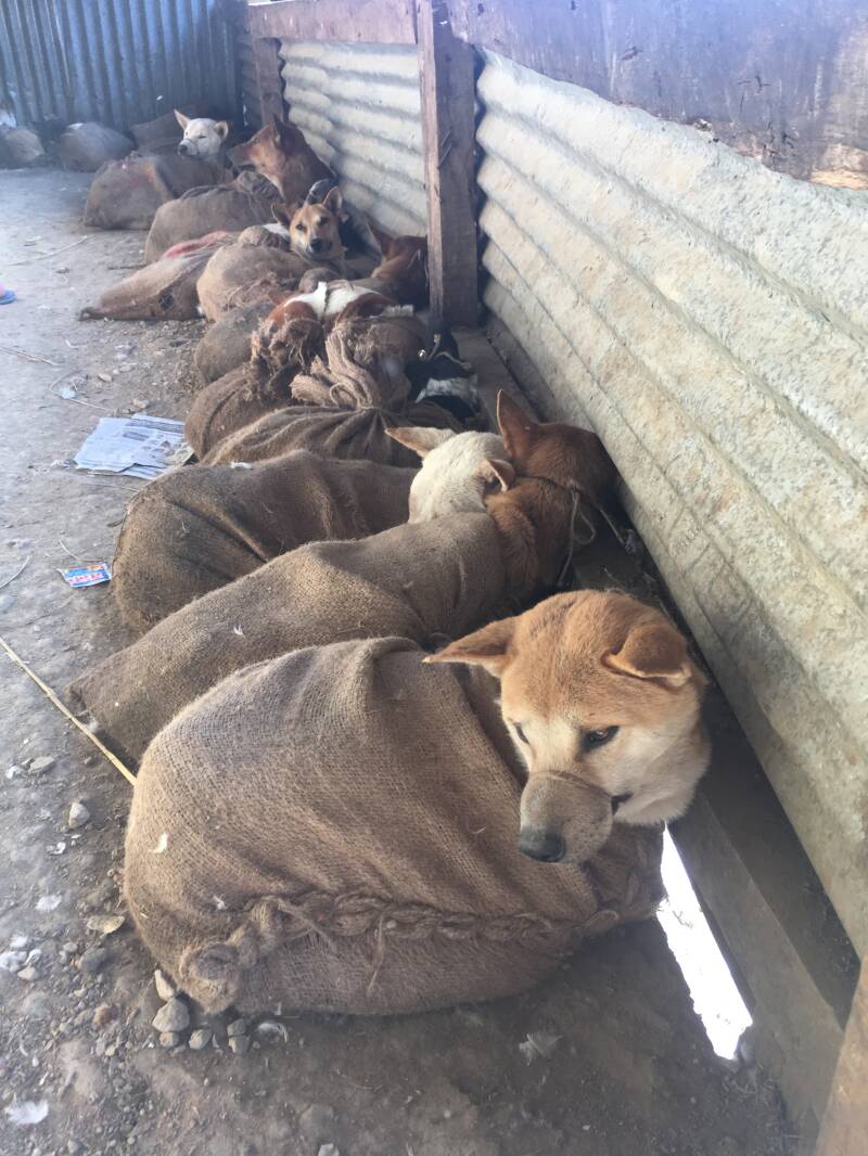Op onze vrije dag bezoeken we de, grotendeels overdekte en uit meerdere verdiepingen bestaande, Mao markt waar echt alles te koop is. De gangpaden tussen de honderden stalletjes zijn zo smal dat er bijna geen doorkomen aan is. Op weg naar de markt zien we mensen lopen met een nog levende kerstkip, -eend of -gans. Als we op de markt bij de kraampjes komen, ontsnapt er net een haan die de boel op stelten weet te zetten wanneer zijn verkoper hem probeert te vangen. Zoals gezegd, de Naga’s eten alles, dus we komen nog andere dieren tegen die op de kersttafel zullen eindigen. Na de kippen komen we diverse kooien vol met witte muizen tegen en liggen er honderden plastic zakjes gevuld met kleine groene levende kikkertjes. Ze eten hier niet alleen de kikkerbilletjes, maar gewoon het hele kikkertje. Er moeten ook zijderupsen te koop zijn om te bakken of te koken, maar die zien we niet. Tanja heeft ze wel gezien en laat er later een foto zien. De meeste indruk maken de honden op ons, waarvan de setting ons duidelijk maakt dat zij ook voor consumptie bedoeld zijn.