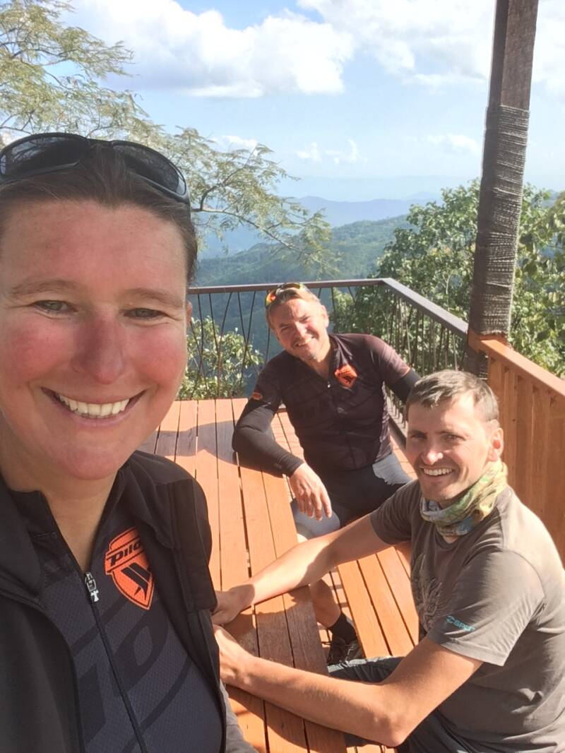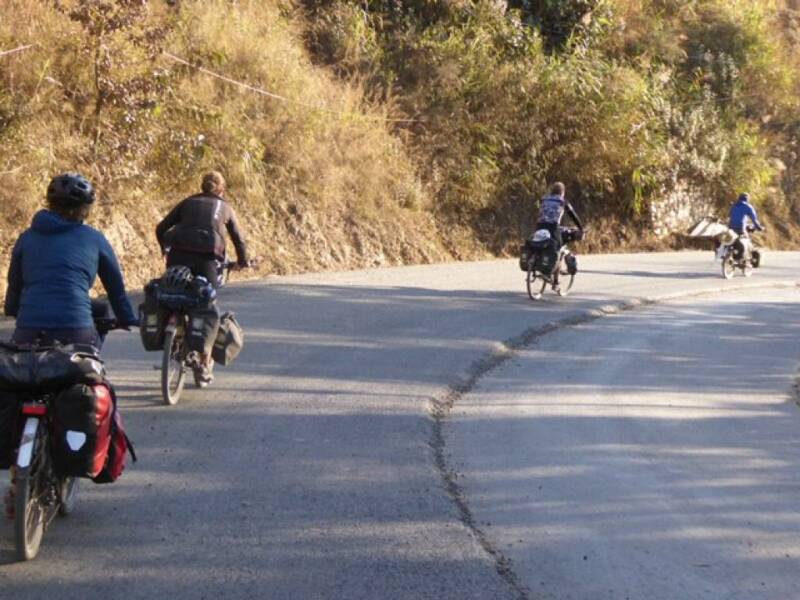 De weg en het stijgingspercentage blijkt reuze mee te vallen. Halverwege stopt een minibusje met twee bekende Oostenrijkse fietsen op het dak en vele bekende tassen binnenin. Tanja trakteert ons op snickertjes en Jakob kijkt enigszins beteuterd: ook hij heeft vanuit de taxi kunnen constateren dat de weg best te fietsen is, ook met bagage. Na een pauze nemen ze weer plaats in het taxibusje en wij op de zadels.