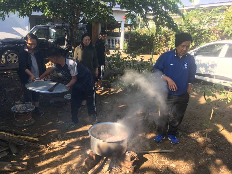 De oom nodigt ons uit om daarna bij het koken te kijken. Buiten op het voorterrein staat een grote pan op een houtvuur. In vet van het varken bakt men de in stukjes gesneden organen: nieren, lever, hart. Ondertussen vertelt de oom honderduit over alles wat wij maar willen weten en wat hij ons wil laten weten. Hij is al ver in de zestig maar ziet er topfit en gelukkig uit. Dit valt goed te verklaren want hij was vroeger een top badmintonspeler (aha vandaar het trainingsjasje), had een goede baan als een directeur van het onderwijsdepartement binnen Nagaland en heeft al zijn kinderen naar de universiteit kunnen begeleiden.