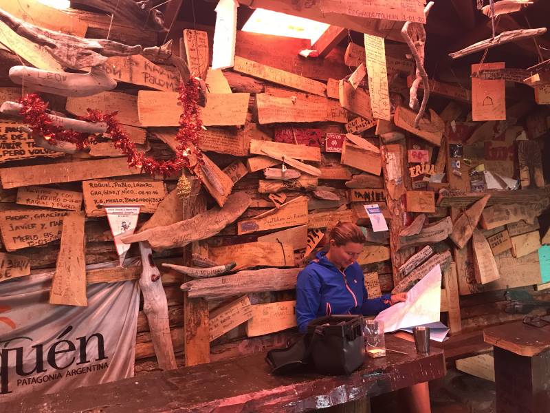 Tolhuin is een eigenaardig stadje. Het ziet er wat armoedig, ruig en pioniersachtig uit. Maar er hangt ook een creatieve sfeer. De camping waar wij ons tentje zullen opzetten is hiervan een goede afspiegeling. Het is een chaotische verzameling van opstallen (keuken, toiletgebouw en een boel windshelters voor tenten en barbecueplekken) die allemaal bestaan uit gerecycled materiaal, voornamelijk hout en metaal, maar ook plastic en glas. Creatief en leuk om te zien, maar aan de andere kant niet echt praktisch en zeker niet schoon te houden. Het is weekend en we zien families waarvan we verwachten dat er gefeest gaat worden. Daar willen we liever niet te dichtbij staan. Op advies van de campingbazen kiezen we een plek in de luwte achter een schutting. De bazen, vader en zoon, vertellen dat de families voor het vallen van de nacht zullen vertrekken en er geen gefeest met muziek plaats vindt. Dat gebeurt op een andere camping verderop. Was dat maar waar... We zetten snel onze spiksplinternieuwe tent op. Althans dat was het plan, maar het ongeoefend opzetten van deze tent gaat nog niet helemaal soepel. Als die eenmaal staat zijn we dik tevreden met ons nieuwe huisje. Rond middernacht komen de buren terug bij hun tent die aan de andere kant van de schutting staat die aan de andere kant van de schutting staat en tot 5 uur blijven deze jongens drinken, lachen en irritant veel herrie maken. Vader campingbaas is blijkbaar de volgende ochtend door iemand ingeseind en komt tig keer langs om zijn verontschuldigingen aan te bieden voor de nachtelijke overlast, terwijl hij de jonge knullen uit hun 3-urige slaap wakker maakt en sommeert te vertrekken.