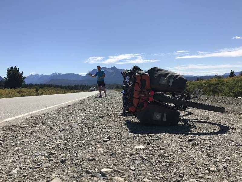 Eenmaal gedropt op de Ruta 40 kiezen we ervoor om met de fiets aan de hand in de richting van het volgende dorpje te wandelen en bij passerende pick-up trucks de duim omhoog te houden. Zo maken we het ook duidelijk dat we pech hebben en niet dat we er geen zin meer in hebben, mogelijk dat dit iemand sneller over de streep trekt om te stoppen. En inderdaad wordt ons vrij snel weer een lift aangeboden. De chauffeur moet naar Puelo, een dorp zo’n 10 kilometer onder El Bolsón. Wij gaan graag met hem mee, desnoods lopen we die laatste 10. Bij een kruispunt vertelt de man dat het de afslag is naar Puelo terwijl hij doorrijdt. Wat een engel, hij rijdt om voor ons en zet ons af in hartje El Bolsón. Overigens is de route adembenemend mooi en wat hadden we die graag willen fietsen…