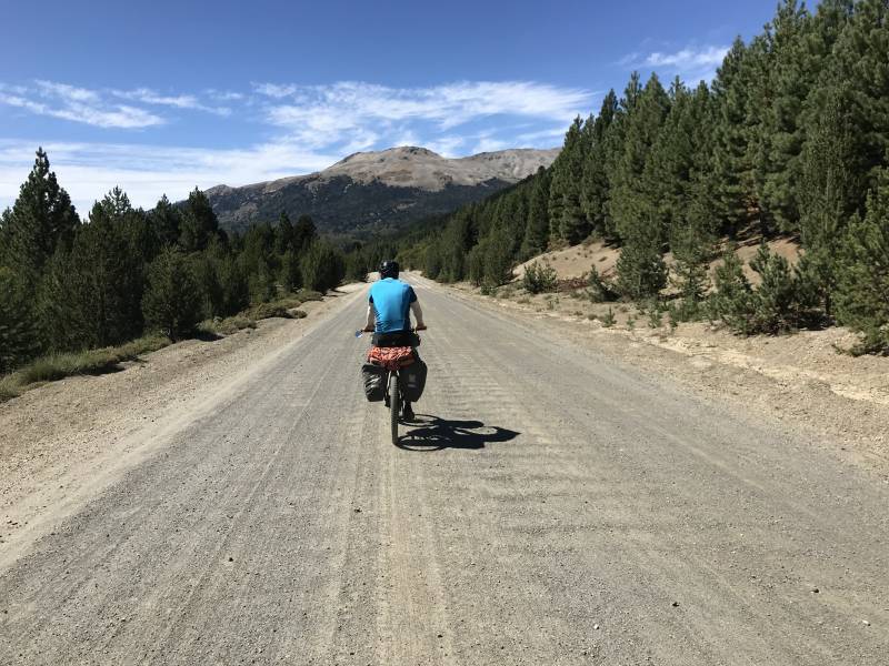 En dan verder over de prachtige Ruta de Los 7 Lagos. We klimmen een paar keer totdat we in de diepte het zevende en dus laatste meer zien liggen, Lago Huenchulafquen. De afdaling is er ene om te onthouden omdat het onafgebroken naar onderen gaat. We hoeven niet te trappen en we hoeven ook niet te remmen totdat we belanden aan de oever van het meer. Via het toeristische plaatsje San Martin de los Andes aan het meer fietsen we door naar het sobere Junin de los Andes. Als we San Martin verlaten wordt het landschap kaler en droger, maar op een gegeven moment valt ons oog op een gigantische vulkaan in het westen, de 3.750 meter hoge Lanín. Hij is bijna volmaakt kegelvormig en dik bedekt met eeuwige sneeuw. De afstand naar de vulkaan is groot en het lijkt bijna of iemand in het bestaande landschap op de achtergrond nog een reuze vulkaan heeft geschilderd.