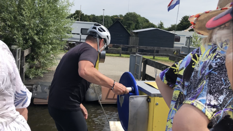 We balanceren daarna op de onzichtbare grens van Drenthe en Groningen. De oversteek over het Drentsche Diep is een pont die men zelf moeten bedienen en waar 6 dames al driftig staan te zwengelen om de pont naar ons toe te krijgen. Met een overvolle pont van uiteindelijk 10 fietsers lukt dat niet echt, waarna Harry toch maar besluit om in te grijpen en ons naar de overkant brengt.